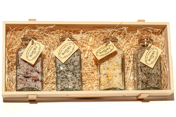 Drevená darčeková krabička s vekom, vystlaná drevenou vlnou. Obsahuje štyri 250ml fľaše podľa vášho výberu. V konfigurátore nad tlačítkom "Pridať do košíka" vyberte z akých druhov solí chcete zostaviť darčekové balenie.