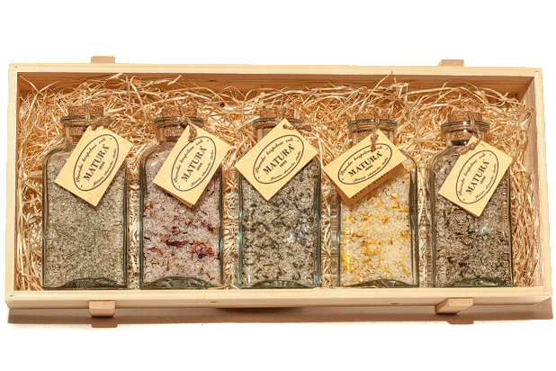 Drevená darčeková krabička s vekom, vystlaná drevenou vlnou. Obsahuje päť 250ml karaf, jednu od každého druhu, ktorý vyrábame.